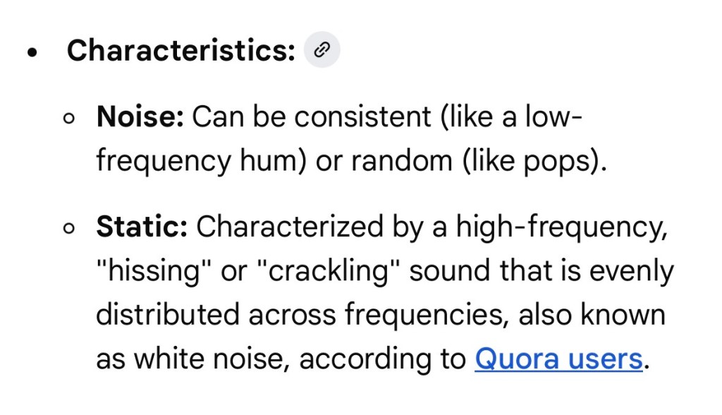 “Hissing or Crackling” may seem like a static answer to a computer coming from a living human being VS. someone interpreting human subliminal messages between two unaltered human beings. Example…The computerized person being the sender and thus receiving the feedback from the human in the form of hissing and crackling called STATIC. Meaning its human form and soul has been altered. If you hear hissing or crackling that’s not really my problem. That’s yours if your a computer it’s what divides us. There is a difference between the two. Means the person hearing the “STATIC” as hissing or crackling, your not technically spiritually online. The message sent back to its computerized recipient clothed in a human form from the actual real life human is “your spiritually dead and we don’t resonate the same way nor do we spiritually compute”